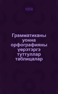 Ааллааҕыскай Н. А. Грамматиканы уонна орфографияны үөрэтэргэ туттуллар таблицалар : начальнай оскуола 1-гы уонна 2-сы кыл. үлэлиир учууталларга пособие / Н. А. Ааллааҕыскай; Учууталлар идэлэрин үрдэтэр Саха Респ. Ин-т. - Якутскай : Учууталлар идэлэрин үрдэтэр Саха Респ. Ин-т, 1958. - 15[2], с., включ. обл. ; 20 см