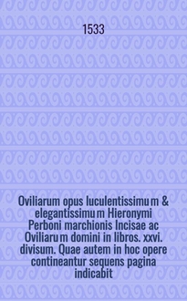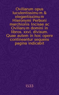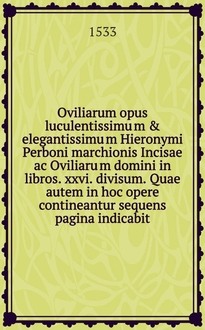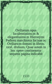 Oviliarum opus luculentissimu[m] & elegantissimu[m] Hieronymi Perboni marchionis Incisae ac Oviliaru[m] domini in libros .xxvi. divisum. Quae autem in hoc opere contineantur sequens pagina indicabit. Lib. 26 : Ad illustrissimum Antonium Livinum: ac ad filios: et omnem posteritatem Paraenetica