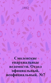Смоленские епархиальные ведомости. Отдел официальный, неофициальный. № 13 (1 - 15 июля 1893 г.): : Год 29. - 1893. - [60] с. разд. паг. : табл. - Сперанский И.П. Указатель статей, помещенных в Смоленских епархиальных ведомостях за все время их существования с1865 по 1876 год включительно. Ч.1(офиц. отд.) Смоленск, 1877, 151с. Приплетено к журн. ...1877, №24, 1878, №23. - Указатель статей по церковно-школьному делу, помещенных в Смоленских епархиальных ведомостях за последние 25 лет (1884-1908 г.г.). [Саратов, 1909] Приплетено к журн. ...1909, №5