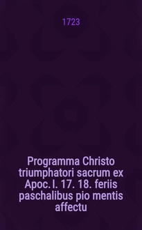 Programma in honorem Jesu Christi, a mortuis redivivi, de pollinctura ejusdem a piis mulieribus tentata, ex Marci XVI, vers. I. feriis ipsis paschalibus debito pietatis affectu publice propositum
