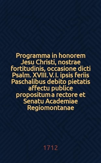 Biblia. Programma in honorem Jesu Christi, a mortuis redivivi, de pollinctura ejusdem a piis mulieribus tentata, ex Marci XVI, vers. I. feriis ipsis paschalibus debito pietatis affectu publice propositum / a rectore et senatu Academiae Regiomontanae. - Regiomonti [Kaliningrad] : typis Reusnerianis, 1699. - [6] л. ; 4° (20 см) см