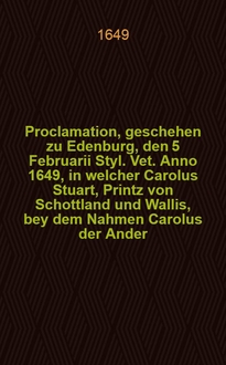 ... Proclamation, geschehen zu Edenburg, den 5 Februarii Styl, vet. Anno 1649, , in welcher Carolus Stuart, Printz von Schottland und Wallis, bey dem Nahmen Carolus der Ander, König von Schottland erkläret und ausgeruffen worden
