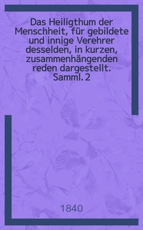Sailer J. M. Das Heiligthum der Menschheit, für gebildete und innige Verehrer desselden, in kurzen, zusammenhängenden reden dargestellt / von Johann Michael Sailer. - 2 rerid und verm. Aufl. - Sulzbach : J. C. v. Seidel'schen Buchh., 1840. - т.т. 1. - (Johann Michael Sailers sämmtliche werke, unter Anleitung des Verfassers / hrsg. von Joseph Widmer ... ; Th 29)