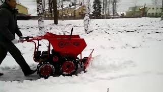 МОТОМУЛ чистит дорогу от снега (мини думпер, мини самосвал МОТОМУЛ)