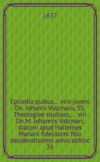Epicedia, in ... obitum ... Annae Giesen, ... Dn. Wilhelmi Hiltebrandi, civis primarij ac pharmacopoei aulici fidelissimi, conjugis dilectissimae natae Stet. anno Christi 1609. 21 Jan. denatae ibidem an. 1637. 10. Aug. ... aetatis suae 28. ann. 6. mens. & 20. d. sepeliendae hodie, nim. 14. ejusdem mensis Aug. die, in aede divo Jacobo Sacra, // Uxor Pinehas in partu occumbens. Oder Die Historia von Pinehas Hauβfrawen, wie sie in der Geburt von grossen ängsten jhr Leben auffgegeben, Wie sie in dem 4. Cap. des 2. Buchs Samuelis geschrieben, Bey der Сhristlichen uind Ehrlichen Beerdigung Der ... Frawen Annae Giesen, Die ... H. Wilhelm Hiltebrands, Vornehmen Bürgers und Fürstl. Hoff Apotekers in A. Stett. ... Hauβfrawen, Welche, nach dem sie eines Söhnleins genesen, bald darauff den 10. Augusti dieses 1637 Jahrs ... verschieden, und den 14. desselbigen in S. Jacobs Kirchen ... beygesetzet worden