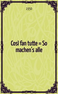 Моцарт В. А. Così fan tutte, ossia La scuola degli amanti [Ноты] : dramma giocoso in 2 Akten : KV 588 / W. A. Mozart; Text von L. Da Ponte hrsg. von F. Ferguson, W. Rehm. - Urtext der Neuen Mozart-Ausgabe. - Kassel [etc.] : Bärenreiter, 2011. - XXVII, 631 c. ; 22, 5 см. - (Bärenreiter Urtext)