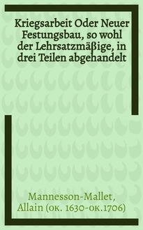 Manesson-Mallet A. Kriegs-Arbeit, oder Kriegs-Kunst : Zerteilet in drei Teile .. / Durch Allain Manesson Mallet ...; Aus dem Frantzösischen verhochdeutschet. - Amsterdam : Bey Wolfgang et al., 1687. - 19 см (8°) см