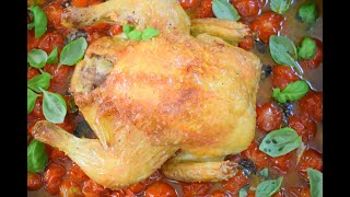 Курица-1,5кг. Помидоры черри-1кг. Чеснок-3 зубка. Базилик. Винный уксус-2ст.л. Мёд-1ст.л. Оливковое масло. Соль. Перец. Розмарин.