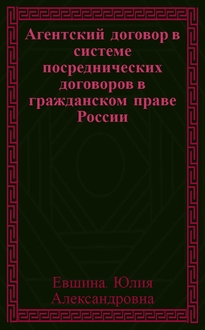 Чмелёва Т. А. Агентский договор : история развития и особенности правового регулирования : [монография] / Т. А. Чмелёва; Министерство образования и науки Российской Федерации, Бурятский государственный университет. - Улан-Удэ : Изд-во Бурятского госуниверситета, 2016. - 129 с. ; 21 см. - Библиогр.: с. 118-129 (180 назв.) и в подстроч. примеч.