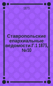 Ставропольские епархиальные ведомости. Г. 22 1894, № 10. Аннотация: В издании содержатся материалы по истории Ставропольской епархии, начиная с момента её образования в 1864 г. и заканчивая 1918 г. Здесь помещены статьи, освещающие деятельность епархиального управления и духовенства в дореволюционный период, деятельность Ставропольской духовной консистории и семинарии, а также статьи об открытии новых храмов и церквей, о жизни и деятельности монастырей, благотворительных учреждений. Большое внимание уделено описанию городов и станиц епархии. Автор:
