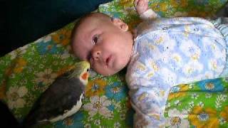 Плутоша (корелла) очень любит Васятку (малыша). Разговаривает с ним, успокаивает - когда тот плачет. Большое спасибо всем за внимание к моим ...