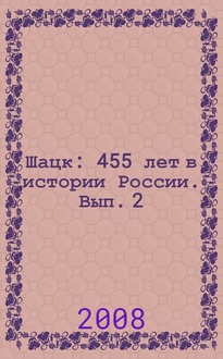 Шацк: 455 лет в истории России : указатель литературы / Упр. культуры муницип. образования - Шац. р-н, Муницип. учреждение культуры "Межпоселен. б-ка муницип. образования - Шац. муницип. р-н"; [сост.: Г.И. Елисеева, библиограф и др.]. - Шацк : Шацкая типография, 2008. - 21 см. - (Города Рязанской области)