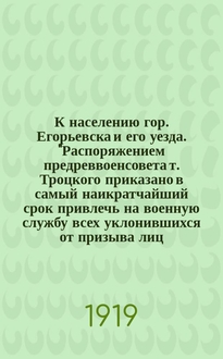 Об организации крестьянских дружин для борьбы с большевиками . - Подписи: Командир Средне-Сибирского корпуса Подполковник Пепеляев. Начальник Штаба, Капитан Кононов . - Датировано по тексту и изд.: ЭГВ. С. 449, 544 . - Опубл. также в газ.: Народная газета. Томск, 1918. 28 июня (11 июля); Труд. Минусинск, 1918. 1 (14) июля . - На листовке рукоп. помета карандашом: 83 . - Электронная копия доступна в Электронной библиотеке РНБ