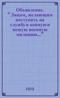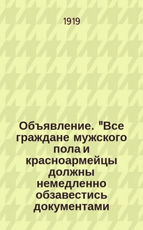 Объявление. "Было замечено несколько случаев, обрезывания телеграфных проводов. Объявляю, что все замеченные лица будут обстреливаться..." / [Хвал. р-н (Хвал. группа войск), 7-й Хвал. стрелковый полк]. - [Хвалынск] : Фабричный Ком. при тип. Голомшток, [1918, июль-авг.]. - Электронная копия доступна в Электронной библиотеке РНБ. 1 с. ; 9х14 см