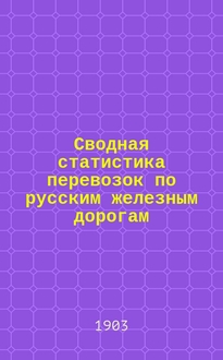 Сводная статистика перевозок по русским железным дорогам : Изд. деп. ж.-д. дел М-ва финансов. 1903, Вып.11 : Гончарные, глиняные и терракотовые изделия. С малою скоростью (Гр. 25 ...). В данной книге описывается „свод статистики перевозок по русским ж. д.“ за 1903 г. Издана Департаментом железных дорог Министерства финансов. В книге собраны результаты проведенных в 1903 году наблюдений за перевозками грузов по железным дорогам России. Всего в книге приведено более 200 различных таблиц и графиков, характеризующих перевозки по железным дорогам страны. Книга будет интересна как специалистам, так и широкому кругу читателей, интересующихся железнодорожными грузоперевозками. ОГЛАВЛЕНИЕ. Введение. 1.
