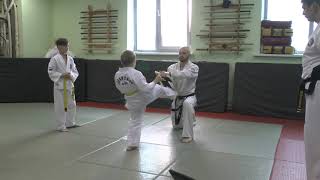 Тренировка юных учеников тхэквондо. Комплексы упражнений и их разбор учителем.. Тренировка проводится в секции тхэквондо в зале общества ...