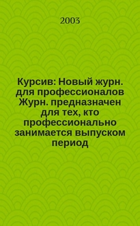 Курсив : Новый журн. для профессионалов : Журн. предназначен для тех, кто профессионально занимается выпуском период. и кн. изд. и пр-вом любой полигр. продукции дизайнеров и специалистов в компьютер. технологиях / Учредитель: АОЗТ "Информтехсервис". 2003, № 6 (44):. - 2003