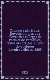 Concours généraux : Devoirs donnes aux élèves des collèges de Paris et de Versailles, textes et corriges, suives de quelques devoirs d'élèves. 1805/1826, Troisième