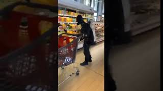 Einkaufen mit Corona Schutzanzug