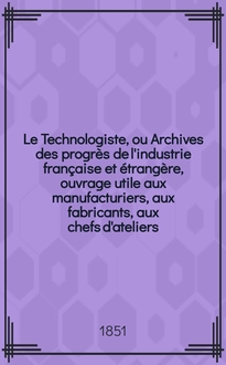Le Technologiste, ou Archives des progrès de l'industrie française et étrangère, ouvrage utile aux manufacturiers, aux fabricants, aux chefs d'ateliers, aux ingénieurs, aux mécaniciens, aux artistes, aux ouvriers. T.9, Août:. - 1848