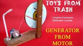 You can make a generator from an old toy motor. Mount a 9-volt toy motor and connect its terminals to a LED. Attach the small pulley on the motor axle to a large ...