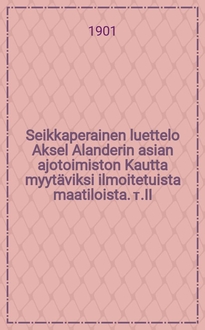 Seikkaperainen luettelo Aksel Alanderin asian ajotoimiston Kautta myytäviksi ilmoitetuista maatiloista. т.VII:. - Hämeenlinna, 1905. - 84 с