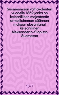 Suomenmaan valtiokalenteri vuodelle 1869 jonka on keisarillisen majesteetin armollisimman säännon mukaan ulosantanut keisarillinen Aleksanderin-Yliopisto Suomessa