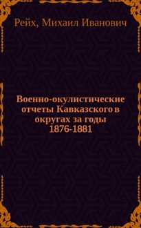 Рейх М.И. Военно-окулистические очерки. 1 2, О глазных больных и о собирании данных для статистики глазных болезней в войсках. Несколько данных, касающихся глазной болезненности в некоторых частях Кавказской армии / [Соч.] Д-ра М. Рейха, окулиста Кавк. воен. окр. - (2-е изд.). - Тифлис : тип. С.Г. Меликова, 1877. - 38 с., вкл. 2 с. обл. ; 23 см. - Библиогр.: "Печатные труды того же автора, относящиеся в глазным болезням" (2-3 с. обл.)