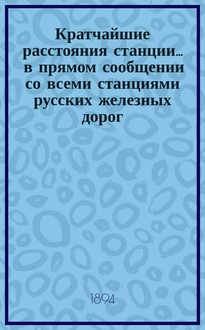 Кратчайшие расстояния станции ... в прямом сообщении со всеми станциями русских железных дорог, соединенных непрерывным рельсовым путем : Сост. по данным, помещ. в Сб. тариф. расстояний : [С прил.] / Сост. [зав. С.-Петерб. гор. ст. казен. ж. д.] И.К. Ольшевский. ... Псков С.-Петербурго-Варшавской ж.-д.:. - 1894. - 10 с