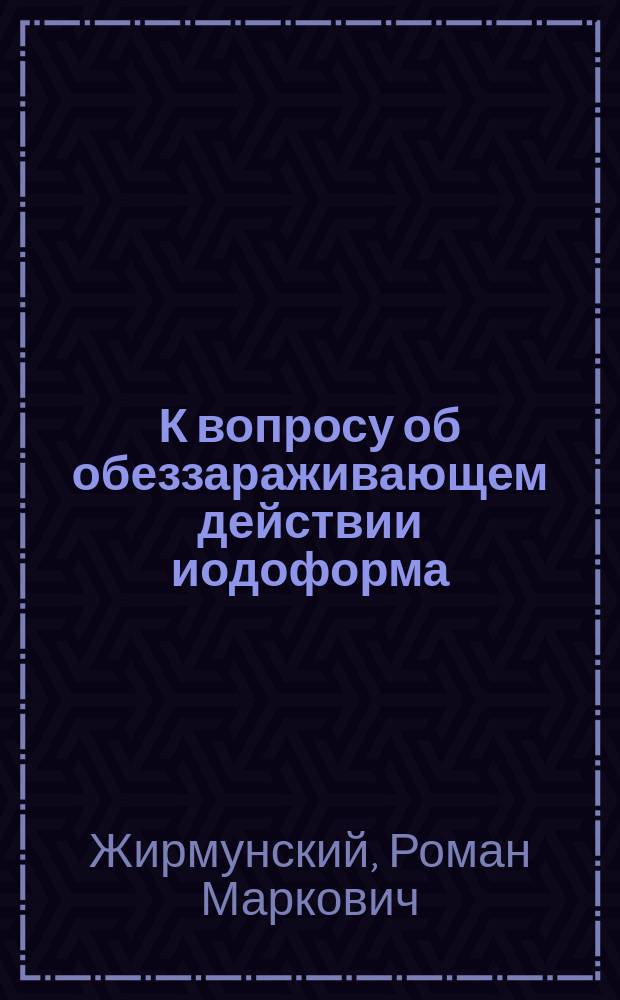 Жирмунский Р.М. К вопросу об обеззараживающем действии иодоформа : Чит. в заседании Моск. хирург. о-ва / [Соч.] Р.М. Жирмунского; Из Клиники проф. А.А. Боброва. - [Санкт-Петербург] : тип. Я. Трей, ценз. 1895. - 14 с. ; 21 см
