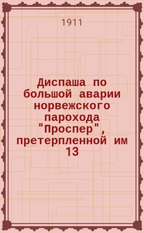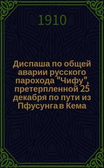 Диспаша по общей аварии Германского парохода "Тсинтау", потерпленной 27 июня 1908 года на Охотском рейде. Капитан Г. Штер / И.Н. Морин, диспашер Владивостокского порта. - Владивосток : тип. В.К. Иогансон, [1913]. - 24 с
