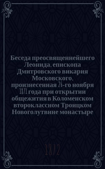 Платон. Беседа высокопреосвященного Платона, митрополита Киевского, о том, что означает и к чему побуждает россиян крушение царского поезда, бывшее на Харьково-Азовской железной дороге, 17 октября 1888 года, при котором благочестивейший государь император Александр III и всеавгустейшее семейство его подвергались величайшей опасности. - Киев : тип. Киево-Печер. Успен. лавры, 1890. - 14 с. ; 22 см