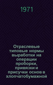 Отраслевые типовые нормы выработки и нормативы времени на операции проборки и привязки основ в льняной промышленности : Утв. М-вом лег. пром-сти СССР 15.09.88. - М. : ЦНИИТЭИлегпром, 1990. - 37 с. ; 22 см. - Библиогр.: с. 36 (7 назв.)