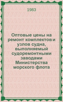 Оптовые цены на ремонт комплектов и узлов судна, выполняемый судоремонтными заводами Министерства морского флота : Прейскурант № 26-05-24 : Утв. ... 06.09.76. Разд. 6: , Вспомогательные двигатели, вспомогательные механизмы и установки. Ч. 1, Вспомогательные двигатели, вспомогательные паровые механизмы МКО : Утв. ... 21.08.84 : Ввод. 01.01.86. - 1985. - 247 с