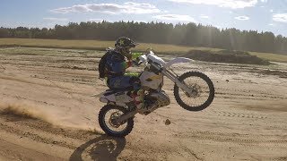 In short, this video shows dirt bikes riding through the woods, wheelie, jumping logs, hill climbing, riding in the mud and sands, including fails and crashes.