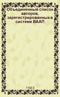 Объединенный список авторов, зарегистрированных в системе ВААП на 1 сентября 1976 года : Т. 1-. В книге описывается история создания и развития Всесоюзного агентства по авторским правам, раскрывается система его взаимоотношений с ведущими учеными, учреждениями, творческими союзами, организациями, отдельными авторами и их коллективами, показывается деятельность агентства и его роль в развитии науки, техники и культуры. Приводятся сведения по истории отдельных организаций, связанных с ВААП; указаны некоторые имена сотрудников ВААП.