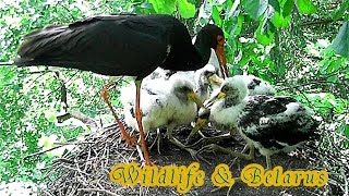 Черный аист кормит птенцов - Black Stork Feeds The Chicks - wildlife