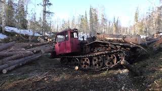 Трелёвочный трактор Тдт-55 толкает лес в штабеля... Пермский край Красновишерск 4 апреля 2019.