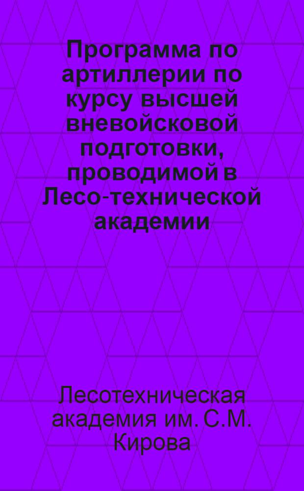 Лесотехническая академия им. С.М. Кирова. Программа по артиллерии по курсу высшей вневойсковой подготовки, проводимой в Лесо-технической академии. - [Ленинград] : Лесо-техн. акад., Б. г (тип. им. т. Григорьева). - 16 с. ; 24×16 см