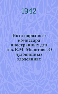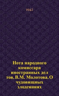СССР. Нота народного комиссара иностранных дел тов. В.М. Молотова. О повсеместных грабежах, разорении населения и чудовищных зверствах германских властей на захваченных ими советских территориях. - Красноярск : Воениздат, 1942. - 38 с