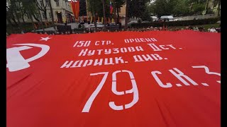 Двухсотметровую копию Знамени Победы встретили в Пятигорске. Символ Победы привезли участники краевого автопробега "Эх, путь - дорожка ...