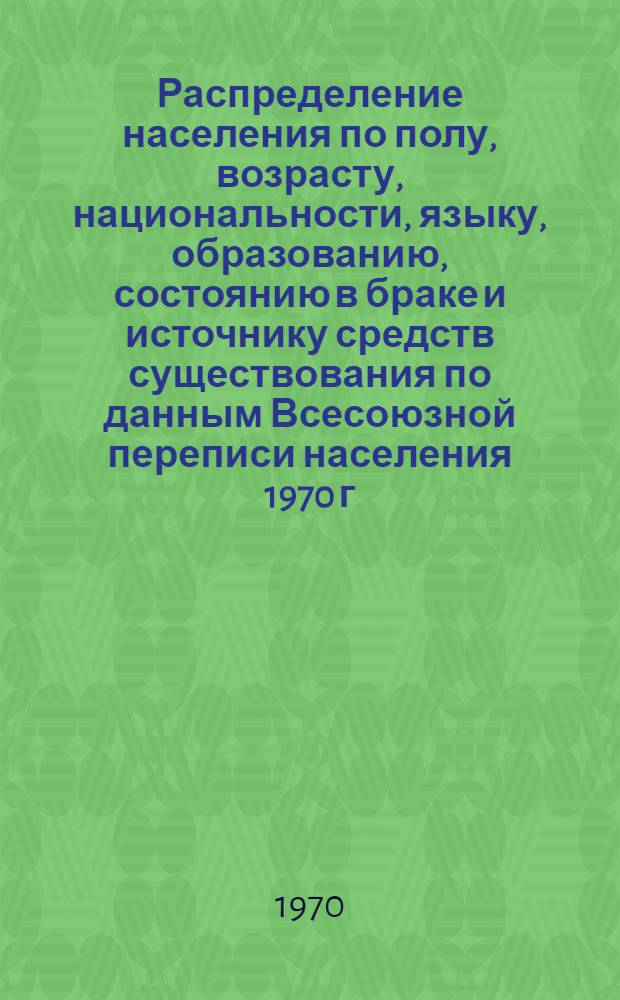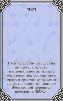 Распределение населения по полу, возрасту, национальности, языку, образованию, состоянию в браке и источнику средств существования по данным Всесоюзной переписи населения 1970 г. : [Табл. 1-10] : [1]- / Центр. стат. упр. при Совете Министров СССР. [10]: , По Архангельской области. - 1970. - [2], 19 л