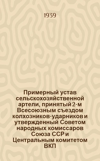 Примерный устав сельскохозяйственной артели; О мерах по ликвидации нарушений Устава сельскохозяйственной артели в колхозах: Постановление Совета Министров СССР и ЦК ВКП(б) от 19 сент. 1946 г.; О мерах охраны общественных земель колхозов от разбазаривания: Постановление ЦК ВКП(б) и Совета Нар. Ком. СССР от 27 мая 1939 г. / Упр. подготовки кадров М-ва сельского хозяйства СССР. Всесоюз. заоч. учетные курсы ВЗУК. Аннотация: Документы колхозного строительства. Оп. 1. - 1947. - 12 л.; 36 см. - С. 26-48. - В надзаг.: Упр. подготовки кад. кадров Минарх. высш. школы РСФСР. - Загл. обл.: Примерный устав кол-хозного схода.