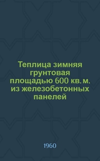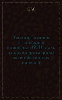 Теплица зимняя стеллажная площадью 600 квадратных м : (Из сборных железобетонных элементов) / М-во сел. хозяйства СССР. Гипросельхоз. - Москва : Б. и., 1960. - [1], 74, [69] с. черт. : черт. ; 30 см. - (Типовой проект ; № 10-118 (1068-2))