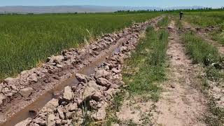 Полив ячменя по каналам, арыкам методом дикого полива, затоплением по бороздам. 28.05.2019 г. Киргизия.