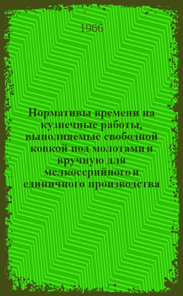 Нормативы времени на кузнечные работы, выполняемые свободной ковкой под молотами и вручную для мелкосерийного и единичного производства (укрупненные строчные) : Утв. Упр. труда, заработной платы и техники безопасности МПС 23/XII 1965 г / М-во путей сообщения СССР. Центр. нормативно-исслед. бюро. - Москва : Транспорт, 1966. - 61 с., 1 л. табл. : ил. ; 21 см