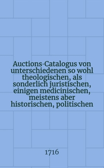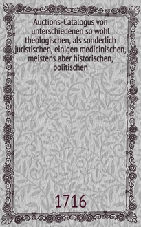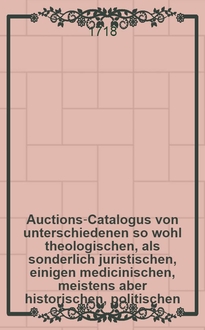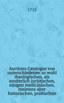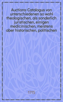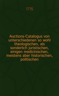 Auctions-Catalogus von unterschiedenen so wohl theologischen, als sonderlich juristischen, einigen medicinischen, meistens aber historischen, politischen, philosoph. Schul- auch vielen frantzösischen und italiänischen, nebst andern curieusen Rohen und gebundnen Büchern ... [1715] : Auctions-Catalogus von unterschiedenen so wohl theologischen, als sonderlich juristischen, einigen medicinischen, meistens aber historischen, politischen, philosoph. Schul- auch vielen frantzösischen und italiänischen, nebst andern curieusen rohen und gebundnen Büchern