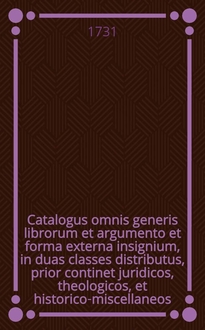 Catalogus librorum miscellaneorum, in duas classes distinctus, prior continet theologico-philologico-historico-philosophico-miscellaneos, posterior vero juridico-miscellanneos, qui Lipsiae d. 3. seqq. Sept. M DCC XXV. in Collegii rubri vaporario auctionis lege vendentur