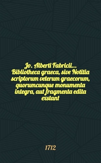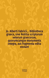 Jo. Alberti Fabricii, SS. Theologii D. ..., Bibliotheca Graeca, sive Notitia scriptorum veterum Graecorum, quorumcunque monumenta integra, aut fragmenta edita exstant: tum plerorumque è MSS. ac deperditis. [Vol. 1
