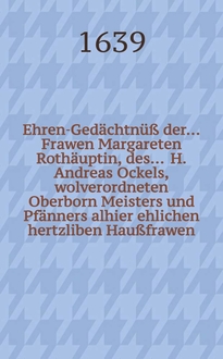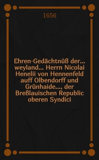 Ehren-Gedächtnüß der ... Frauen Maria, gebohrenen Schmiedin von Schmiedefeld, deß ... Herren Gottfried Tielisches, der Philosophi und Medicin berühmten Doctoris, und Practici bey der Stadt Breßlaw, hertzliebsten und ... gesegneten Haußfrauen, welche den 25. Jenner deß neueingetretenen 1657. Jahres in 22. ihres christlich-geführten Welt-Wandels ... das vergängliche mit dem ewigwehrendem Leben ... seeligst verwechselt und den 4. Tag deß Hornungs darauff ... beygesetzet worden, dem hochbetrübten Herren Wittiber ... zu sonderbahrem Trost auffgerichtet. - Breßlaw [Wrocław] : In der Baumannischen Druckerey Druckts Gottfried Gründer, [1657]. - [16] с. ; 19 см (4°) см